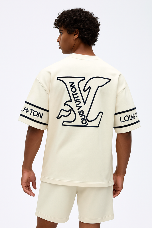 Louis Vuitton White T-Shirt with Bold Black Rope Embroidered LV Logo & Sleeve Branding